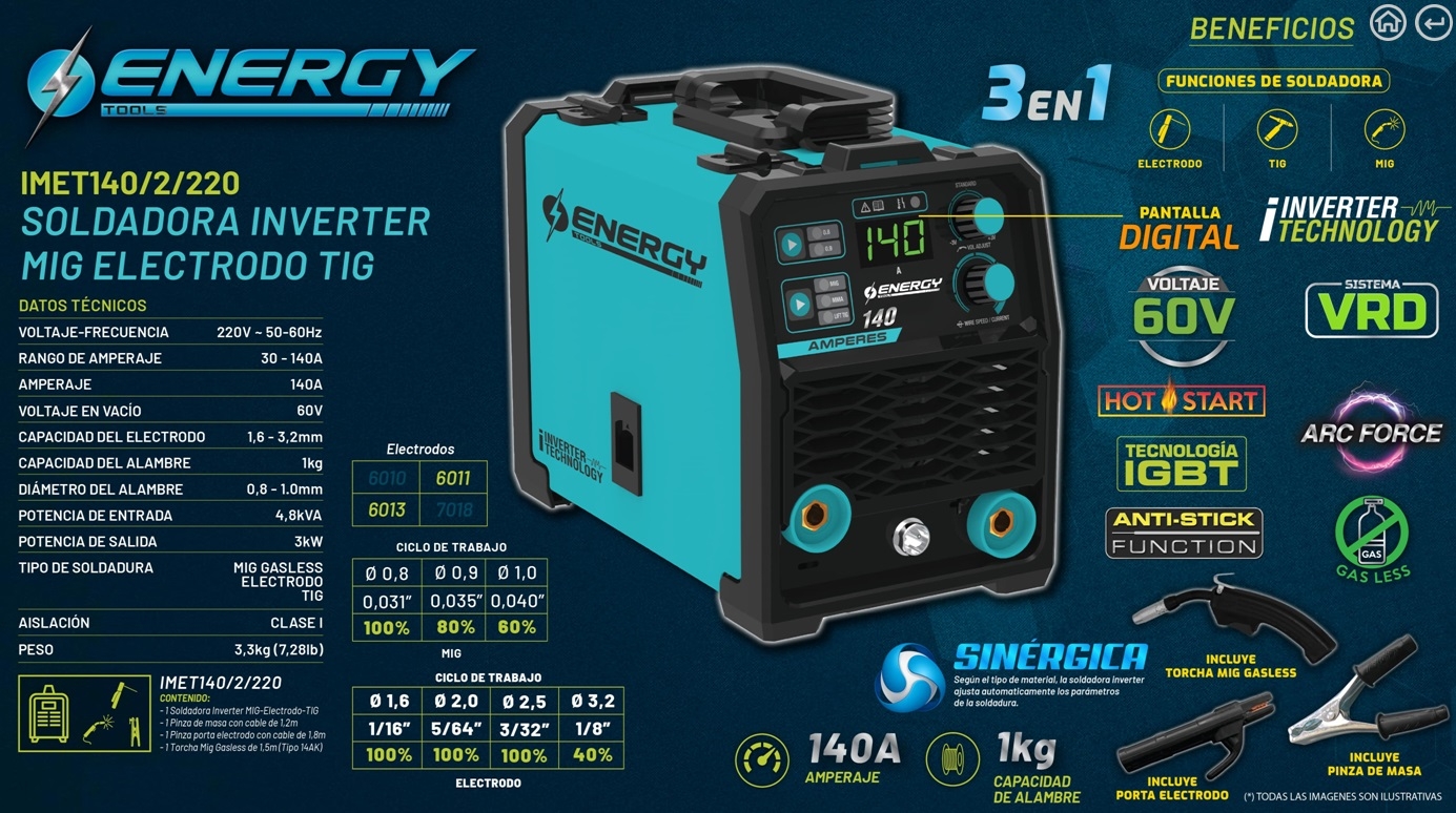 SOLDADORA INVERTER MIG-ELE-TIG 140 amp "ENERGY"