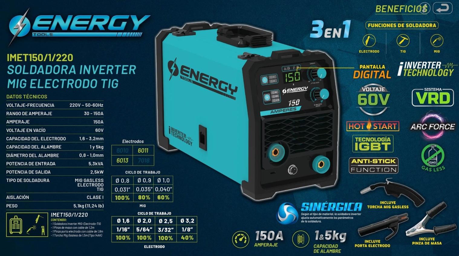 SOLDADORA INVERTER MIG-ELE-TIG 150 amp "ENERGY"